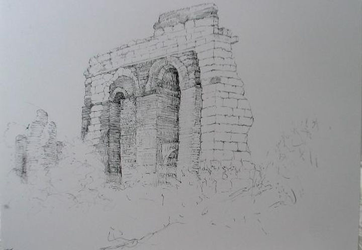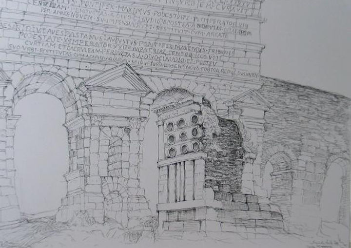 around 30 B.C. and made a prosperous living from this trade, My pen&ink homage to this site Porta Maggiore and its connection not only to the Baker's Tomb but to
